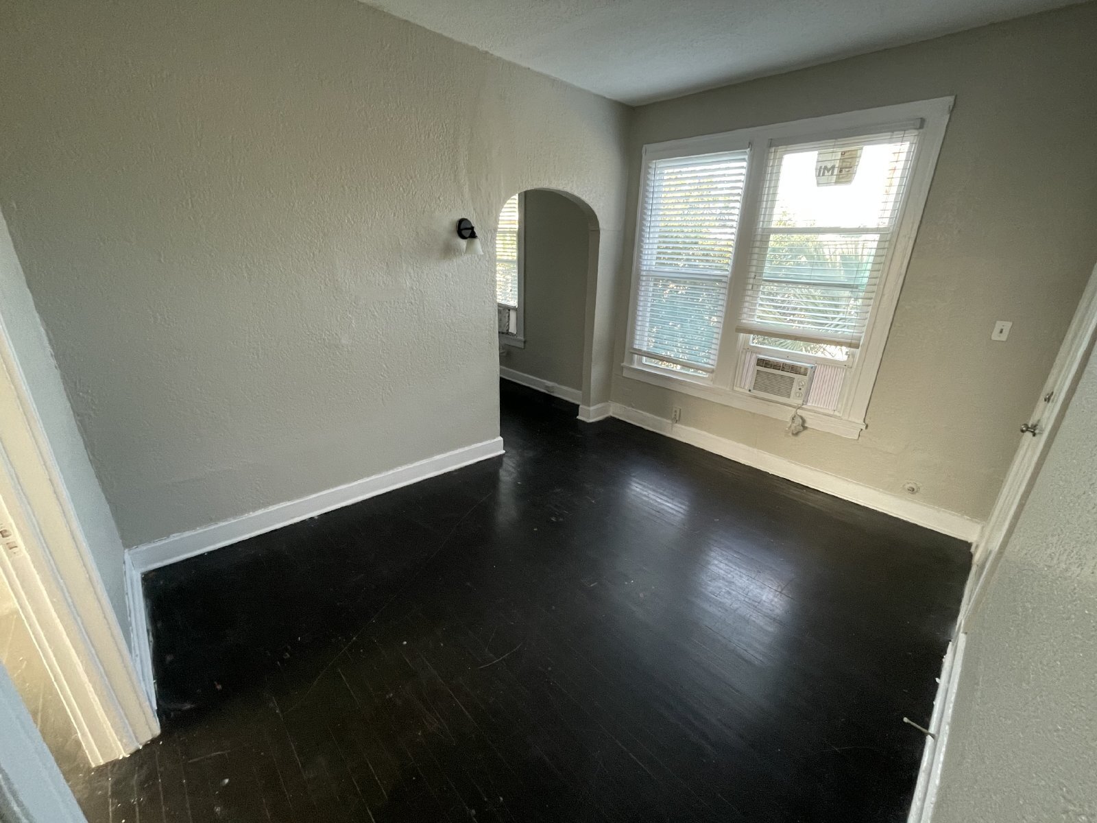 This large one bed/one bath apartment has real wood floors, high ceilings, and a dining area. The property is secured with electronic access codes at the entry level. Comes with a refrigerator, a gas stove, and window AC units. Near downtown, The Pearl, and San Antonio College.